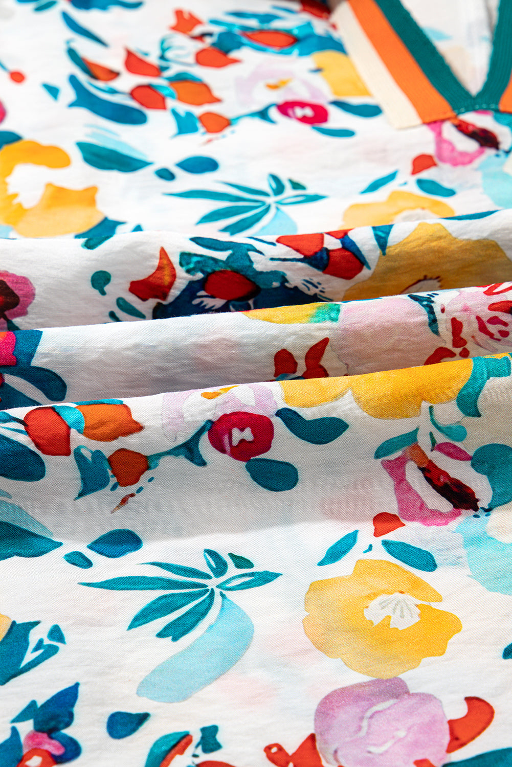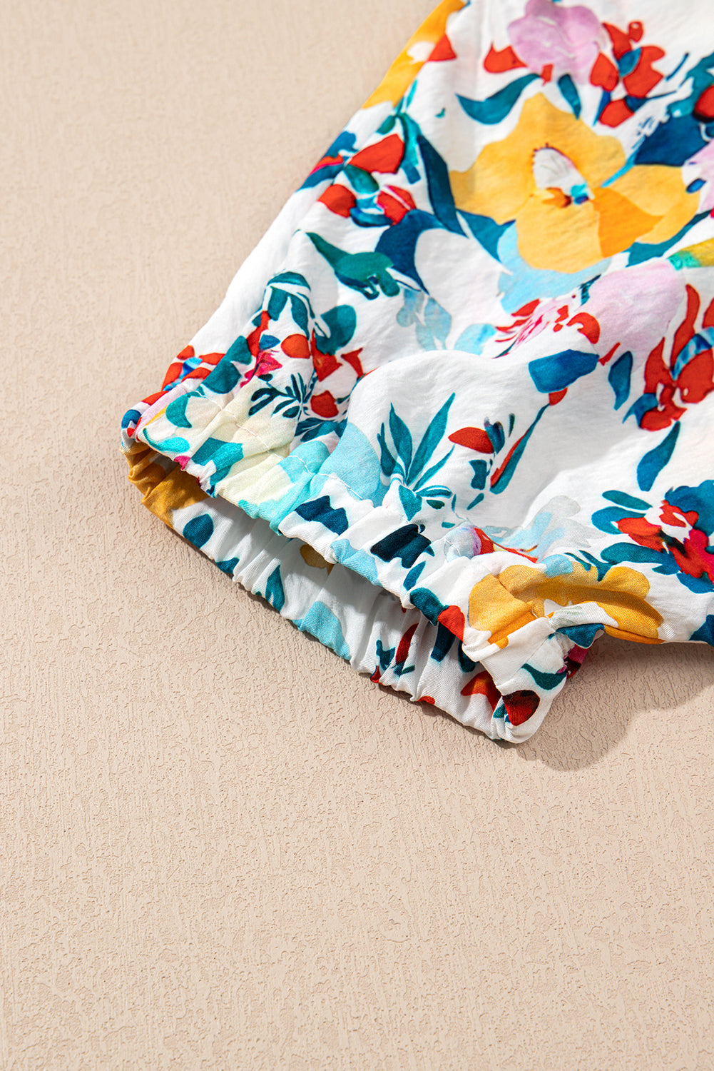 Peacock Blue Floral Print Slit V Neck Short Sleeve Blouse