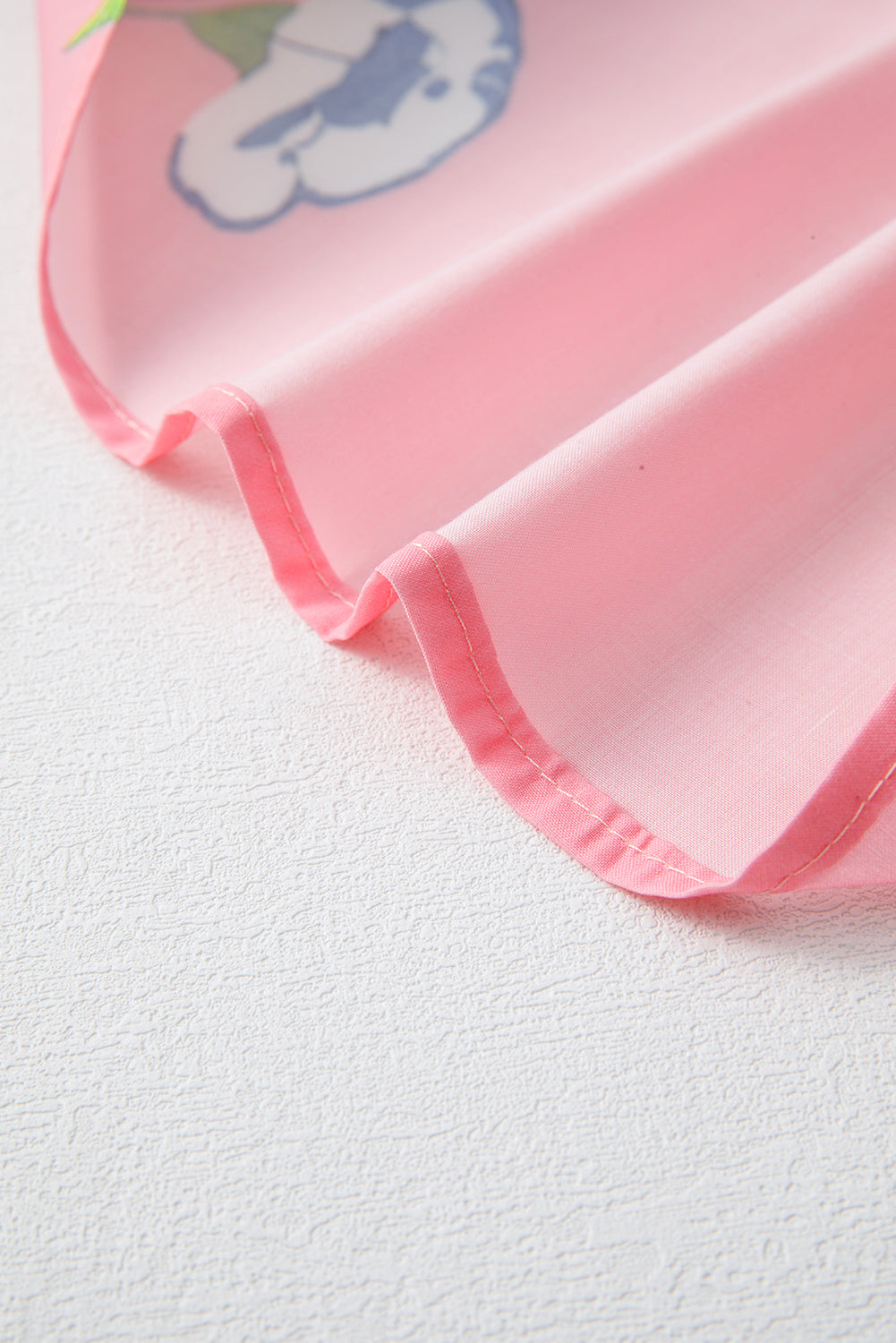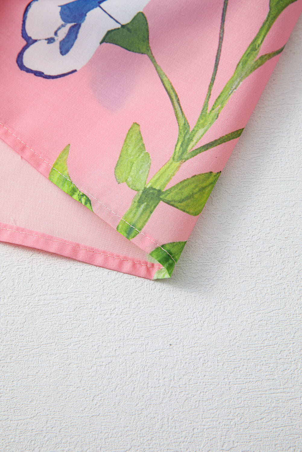 Pink Floral Print Striped Notched V Neck Bubble Sleeve Blouse