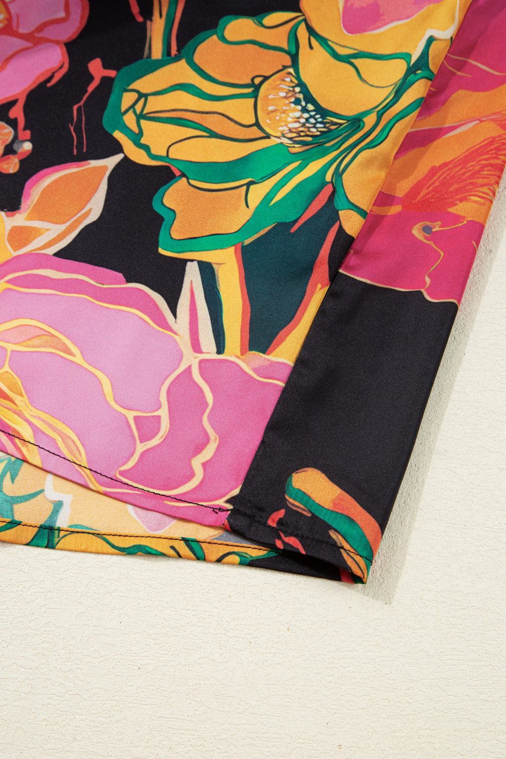 Black Floral Print Smocked Cuffs Puff Sleeve V Neck Blouse