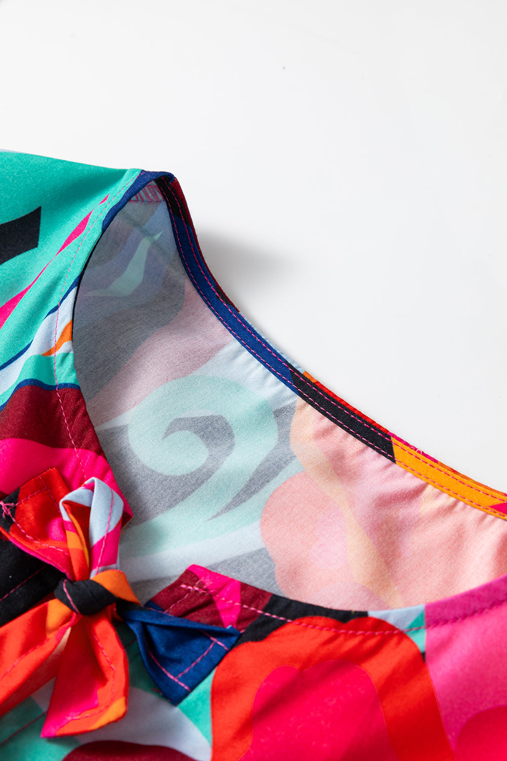 Red Abstract Floral Print Front Tied Puff Sleeve Babydoll Blouse