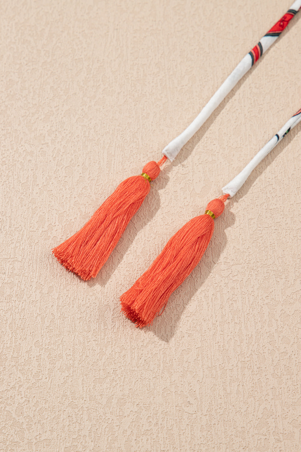 White Floral Print Contrast V Neck Tassel Tie Lace Detail Short Sleeve Blouse